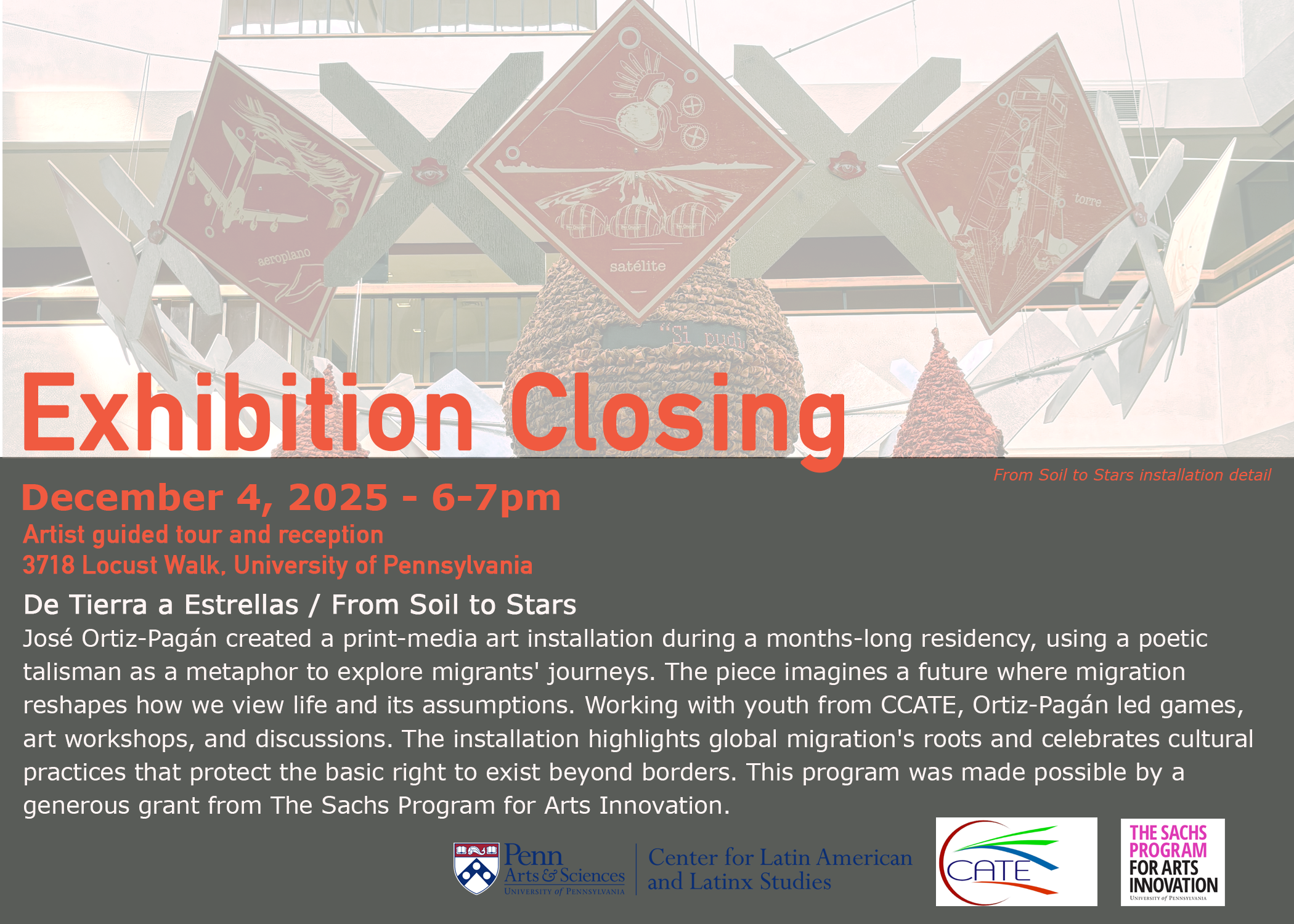 José Ortiz-Pagán created a print-media art installation during a months-long residency, using a poetic talisman as a metaphor to explore migrants' journeys. The piece imagines a future where migration reshapes how we view life and its assumptions. Working with youth from CCATE, Ortiz-Pagán led games, art workshops, and diiscussions. The installation highlights global migration's roots and celebrates cultural practices that protect the basic right to exist beyond borders. The program was made possible by a generous grant from the Sachs Program for Arts Innovation.