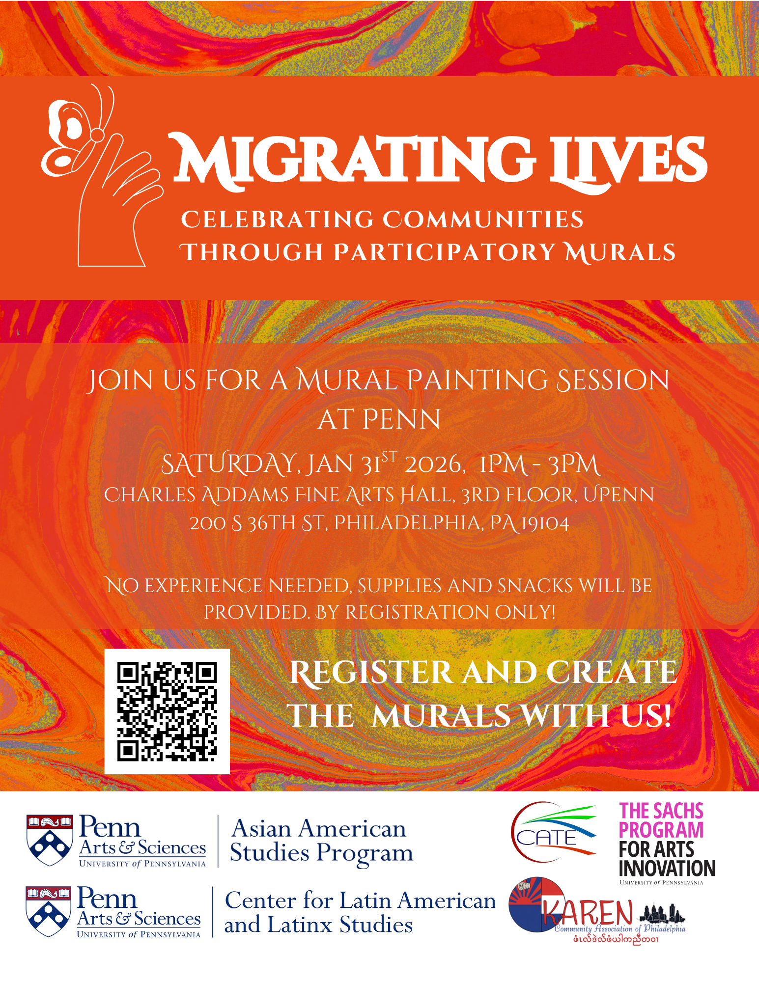 Join us at Migrating Lives, a participatory art initiative led by the Karen Community Association of Philadelphia (KCAP) and Centro de Cultura, Arte, Trabajo y Educación (CCATE), in collaboration with Asian American Studies Program (ASAM) and the Center for Latin American and Latinx Studies (CLALS) at Penn. Learn more about our partnership here!